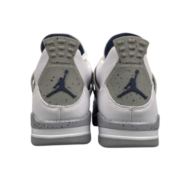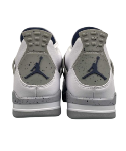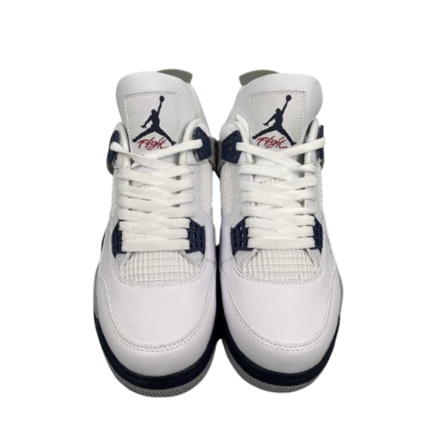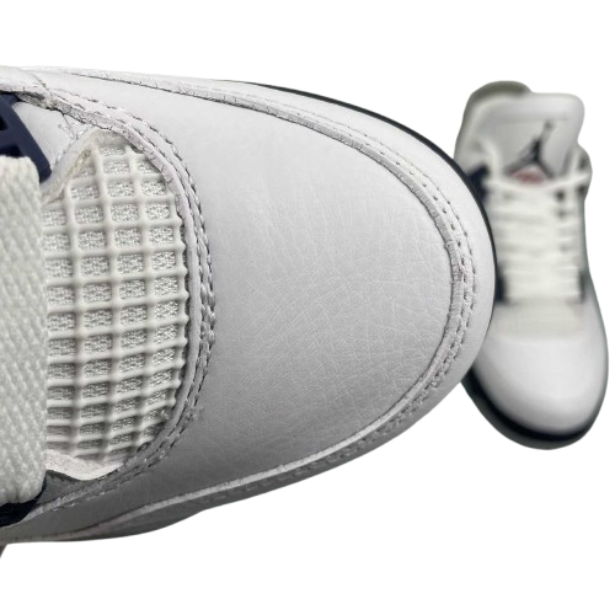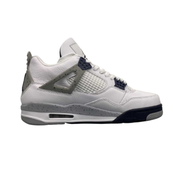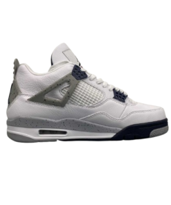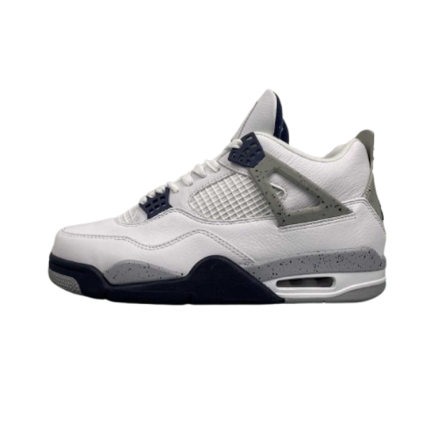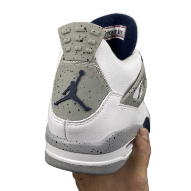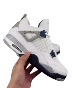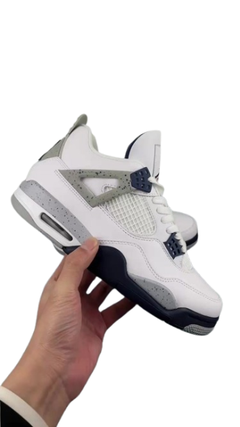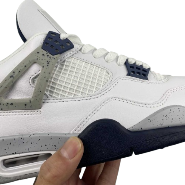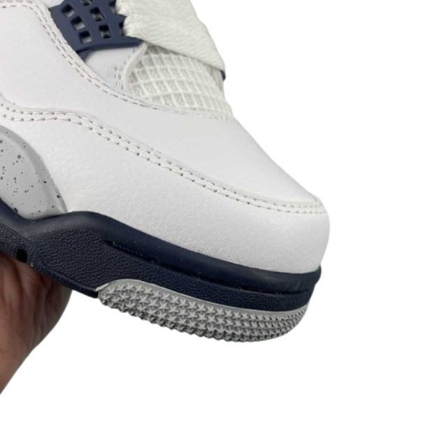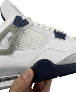 The Air 4 Retro “idnight Navy” Midnight Blue 4 Generation 4 Joe 4 Navy Blue White Blue basketball shoe series is made entirely of leather material, with white as the base color, and decorated with navy blue shoelace holes, midsole and other details. The TPU support plate on the side of the shoe and the midsole are all decorated with light gray, and there is also a black splatter design on top. The blue embroidered Jupan Logos is presented on the tongue, and the shoelaces, tongue, and lining are all designed in white, paired with a deep blue tongue label and lining. The overall appearance is very refreshing, and the TPU material at the heel is also presented in dark gray with the blue Jupan Logo embellishment.