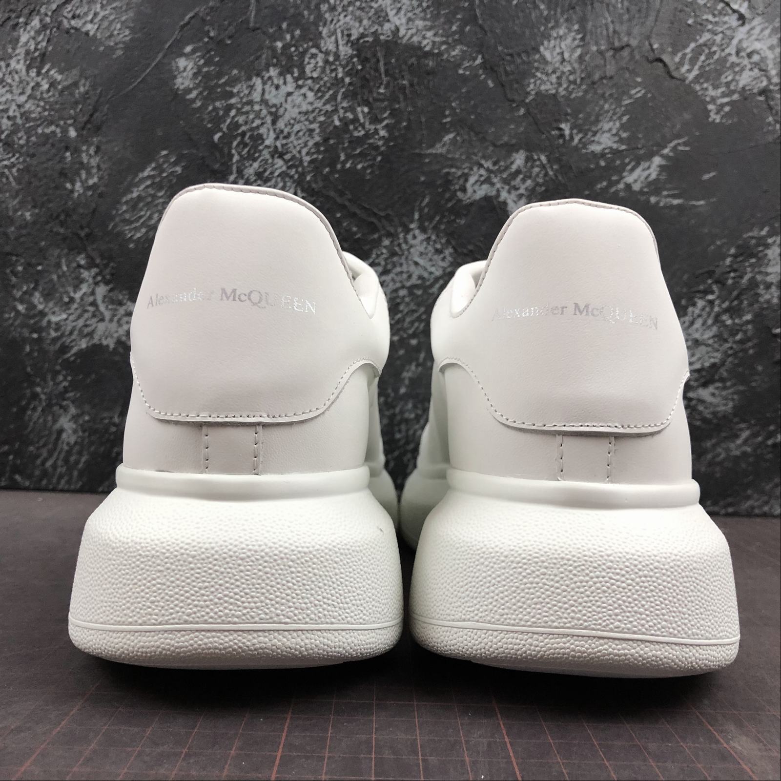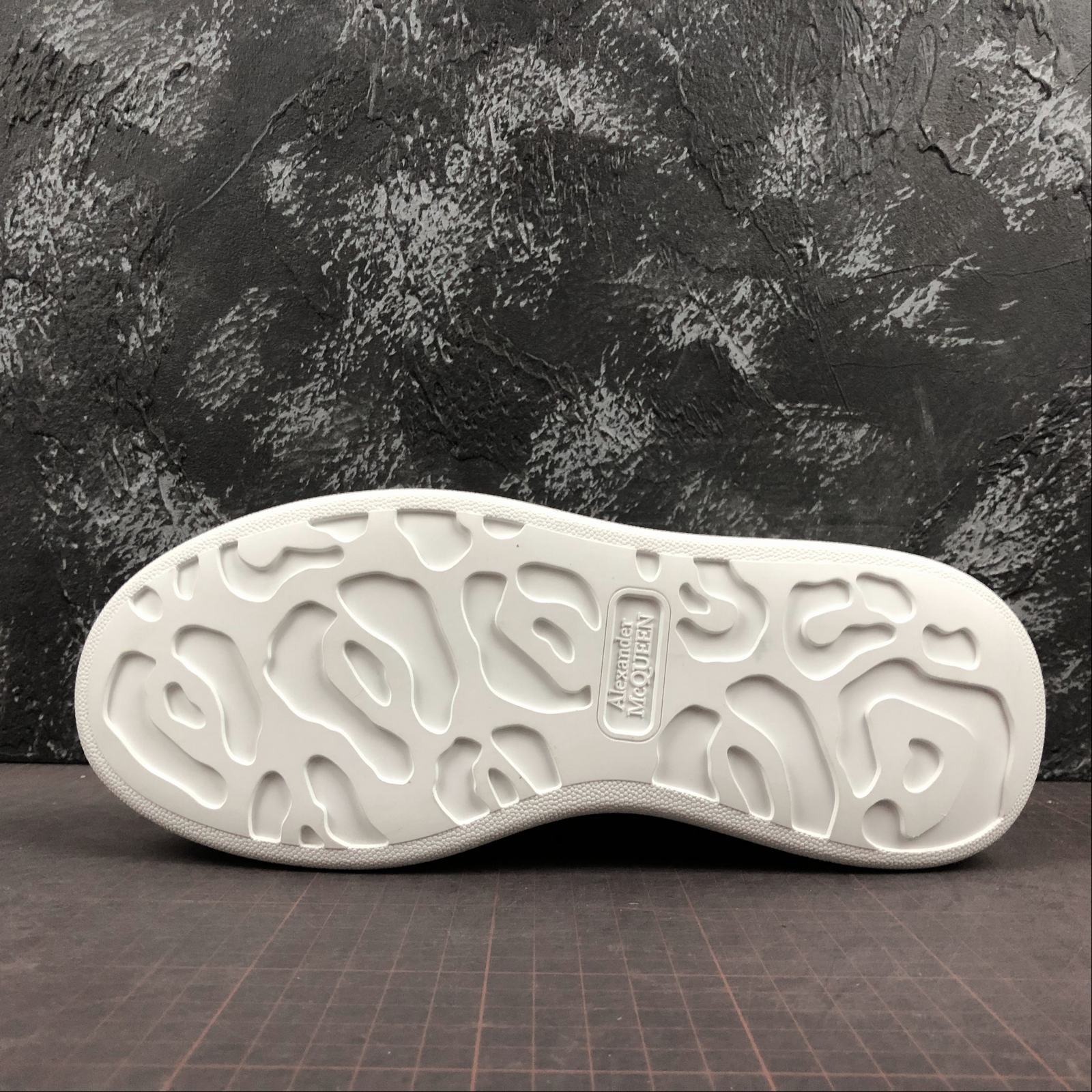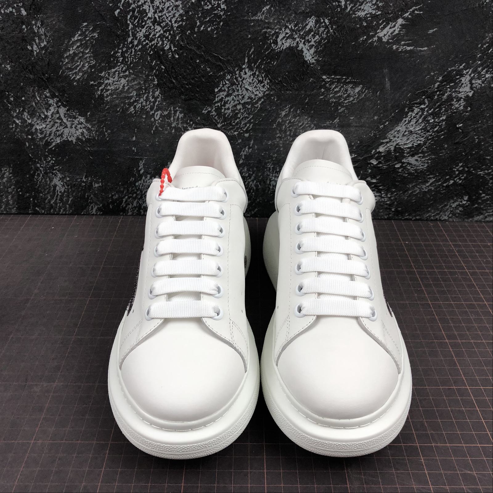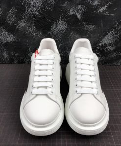 White smooth calf leather lace-up sneaker trimmed with pearlescent transparent fabrication layered over the white calf leather heel counter. The sneaker features large flat laces and an oversized rubber sole. Finished with an Alexander McQueen signature on tongue and heel counter. Oversized rubber sole with signature stamp design. The sneakers come with an additional set of shoelaces.