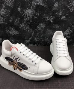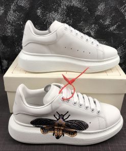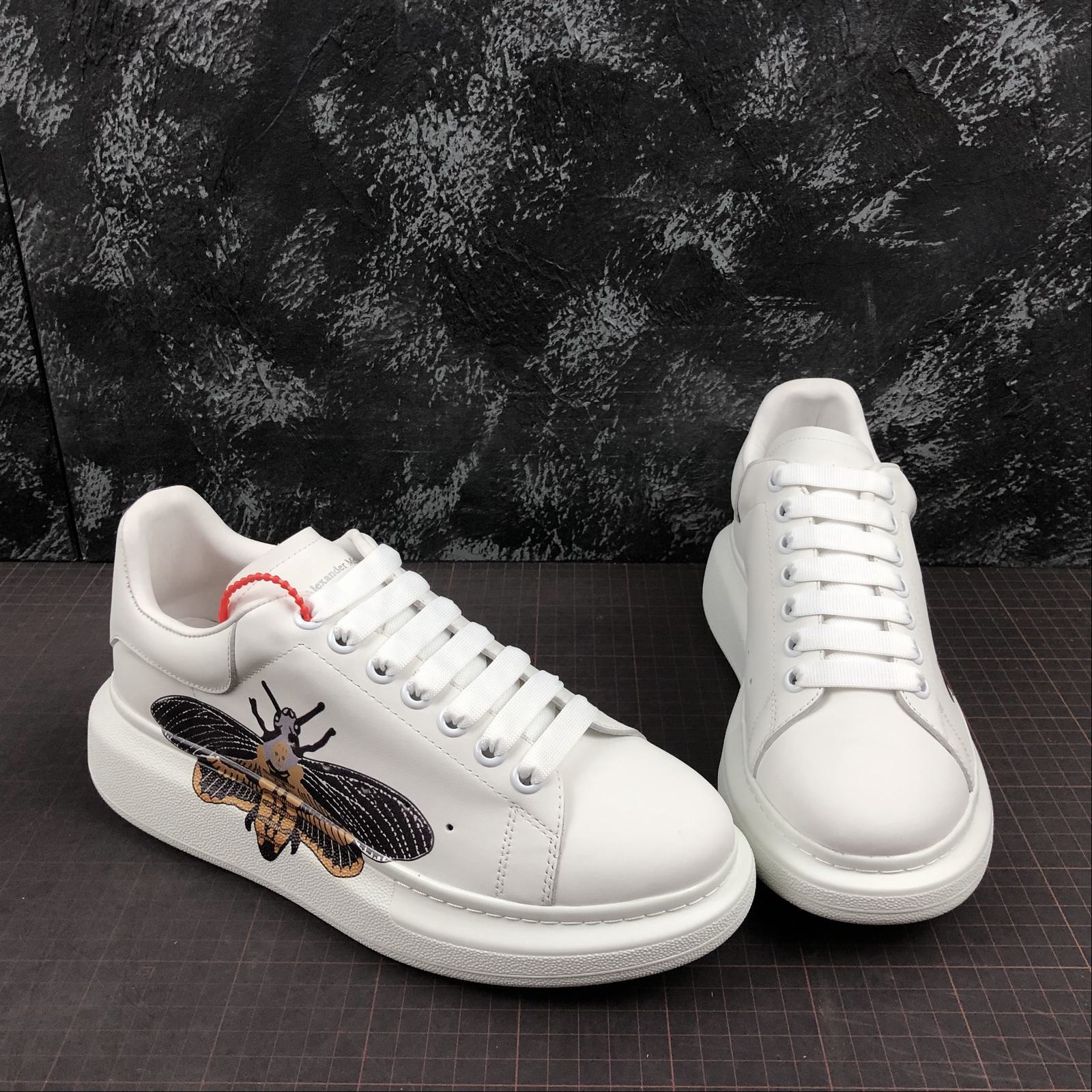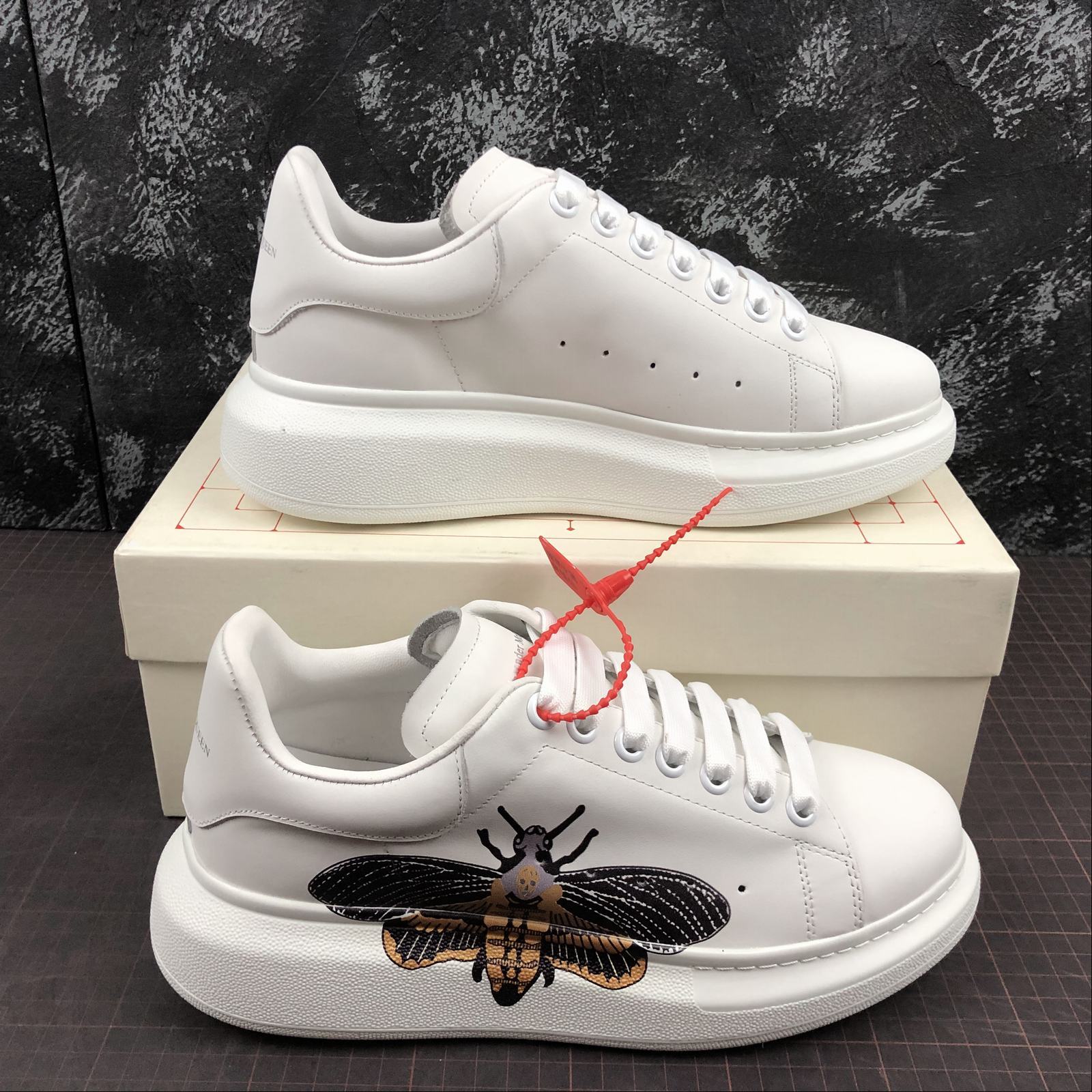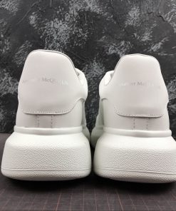 White smooth calf leather lace-up sneaker trimmed with pearlescent transparent fabrication layered over the white calf leather heel counter. The sneaker features large flat laces and an oversized rubber sole. Finished with an Alexander McQueen signature on tongue and heel counter. Oversized rubber sole with signature stamp design. The sneakers come with an additional set of shoelaces.