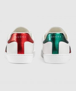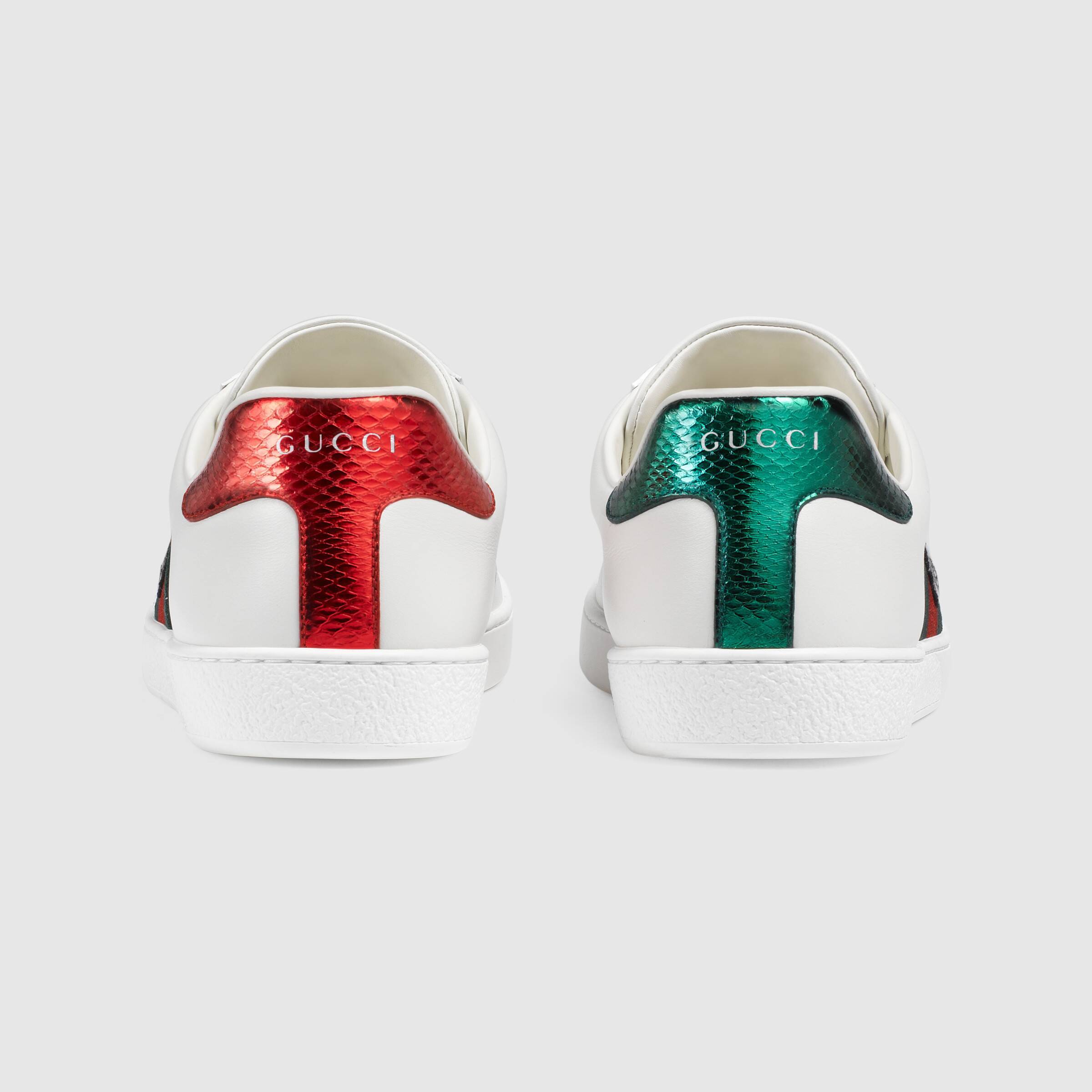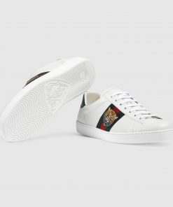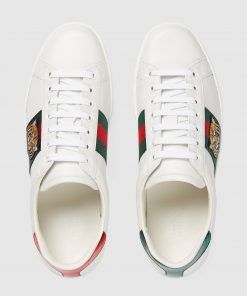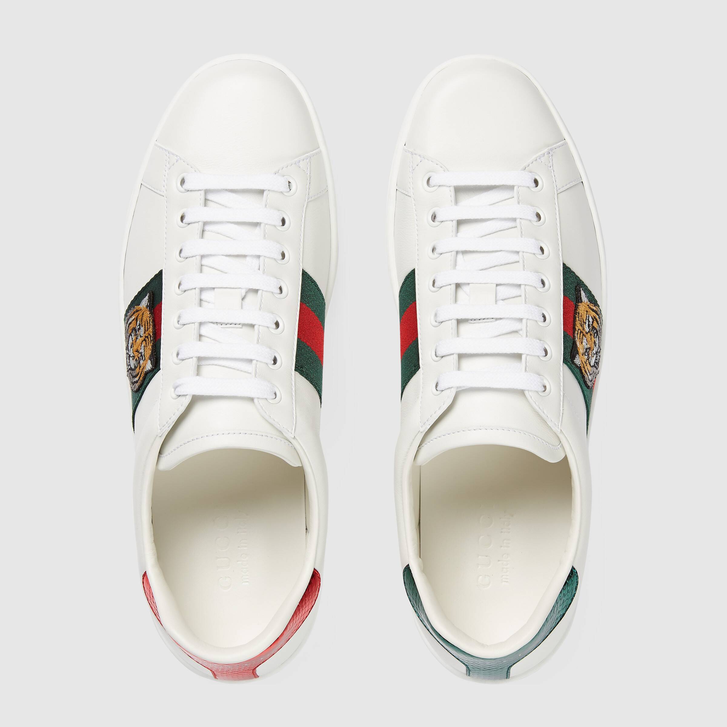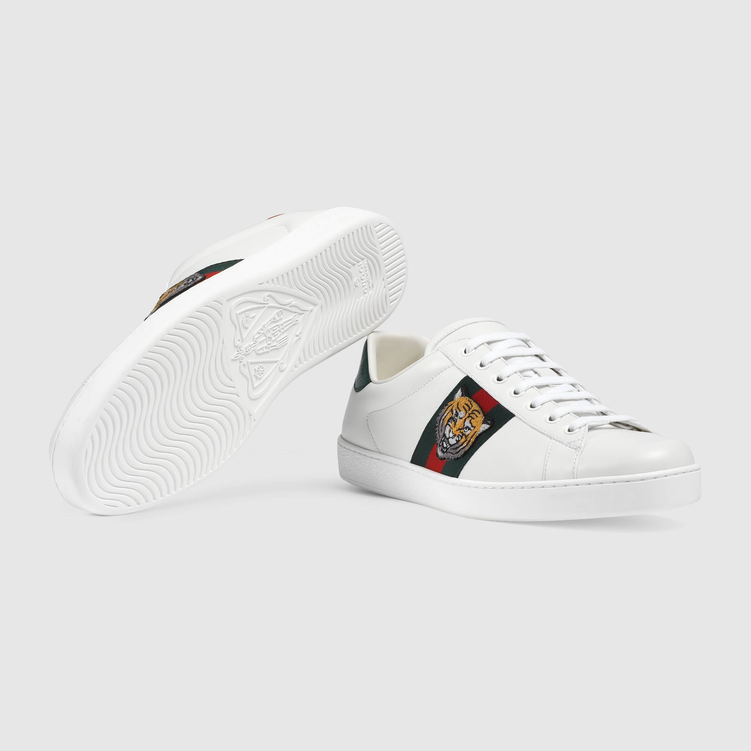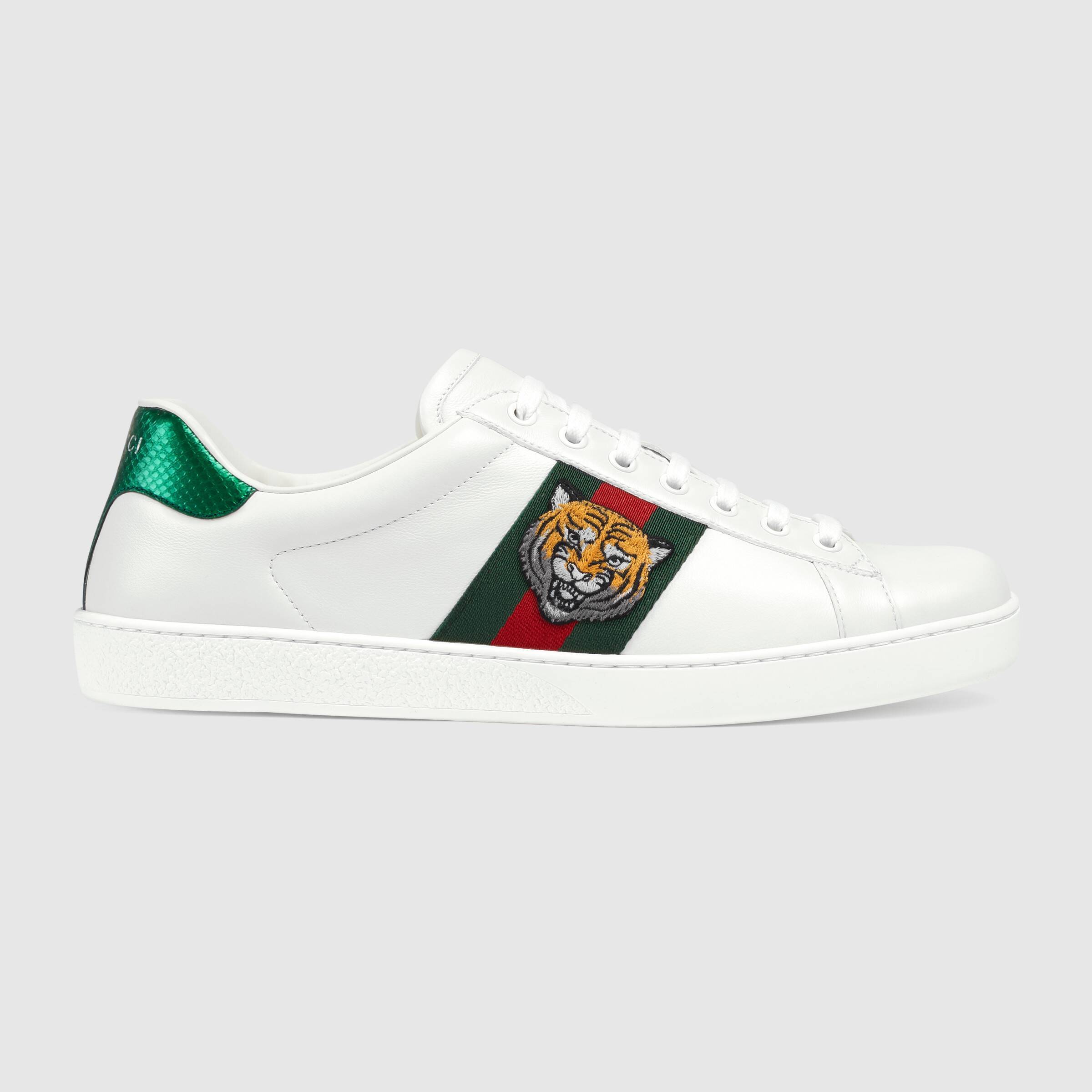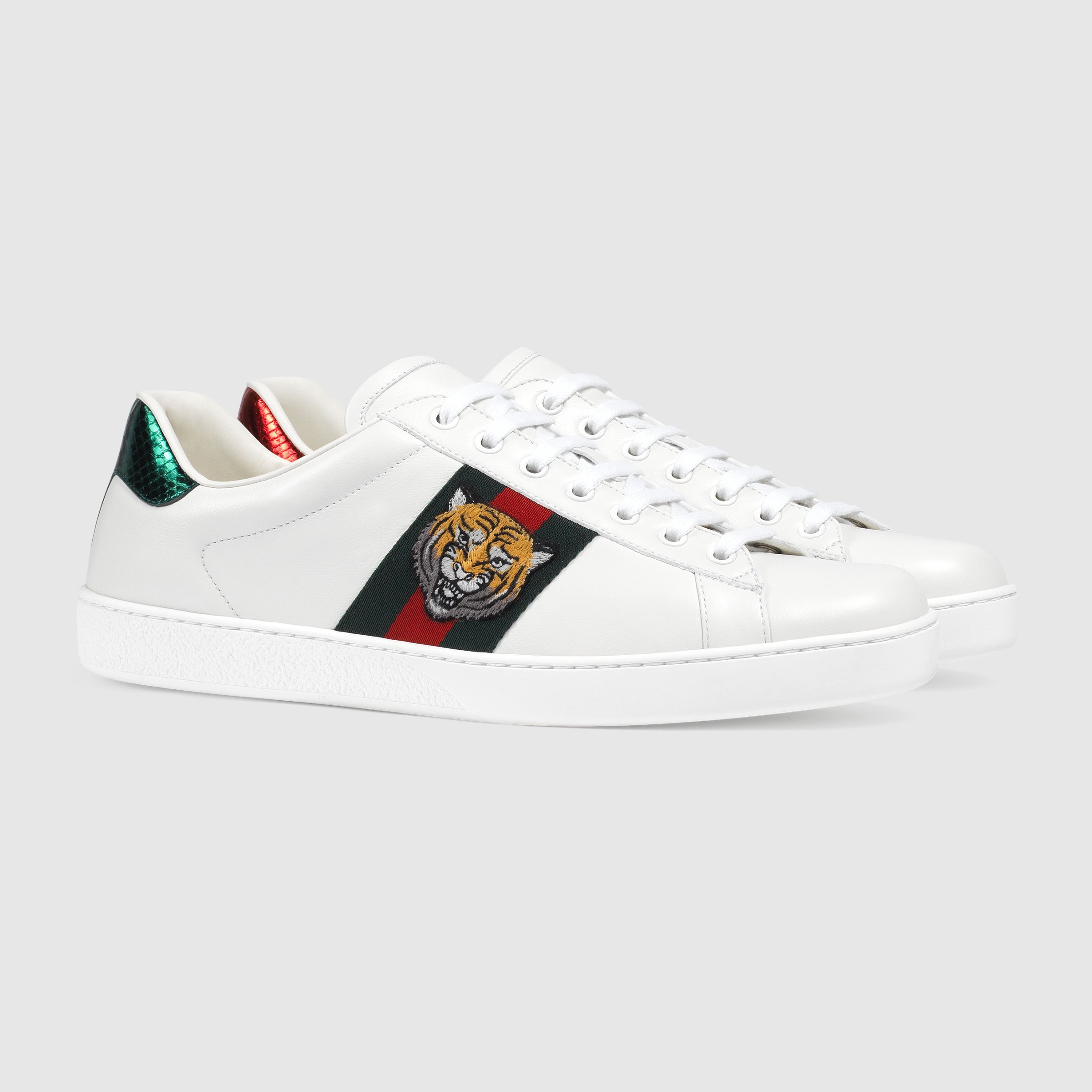 The Ace low-top silhouette with an embroidered tiger appliqué set against the Web.