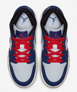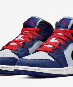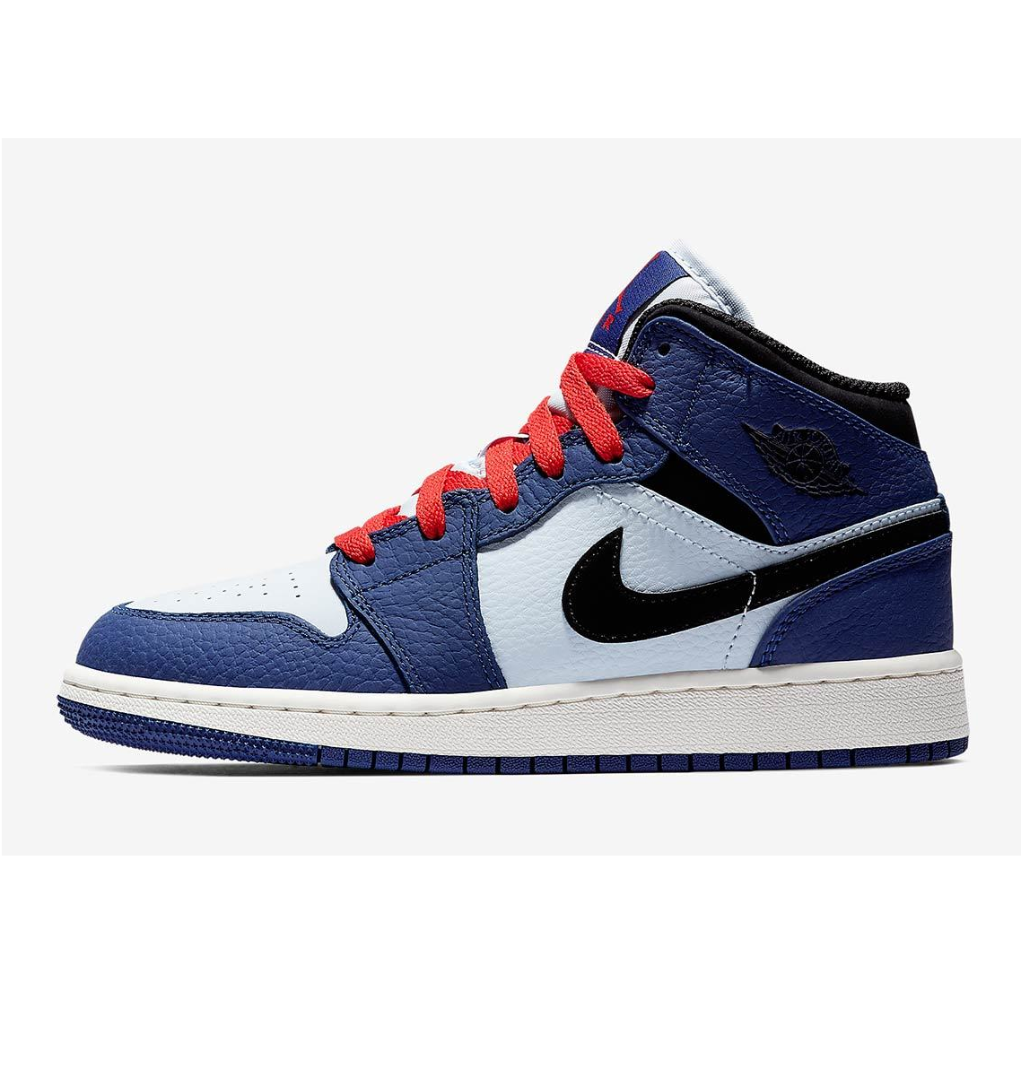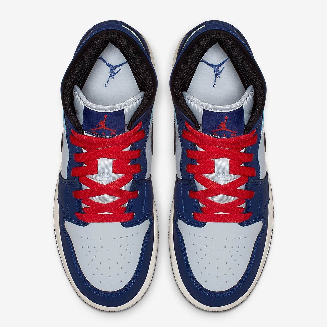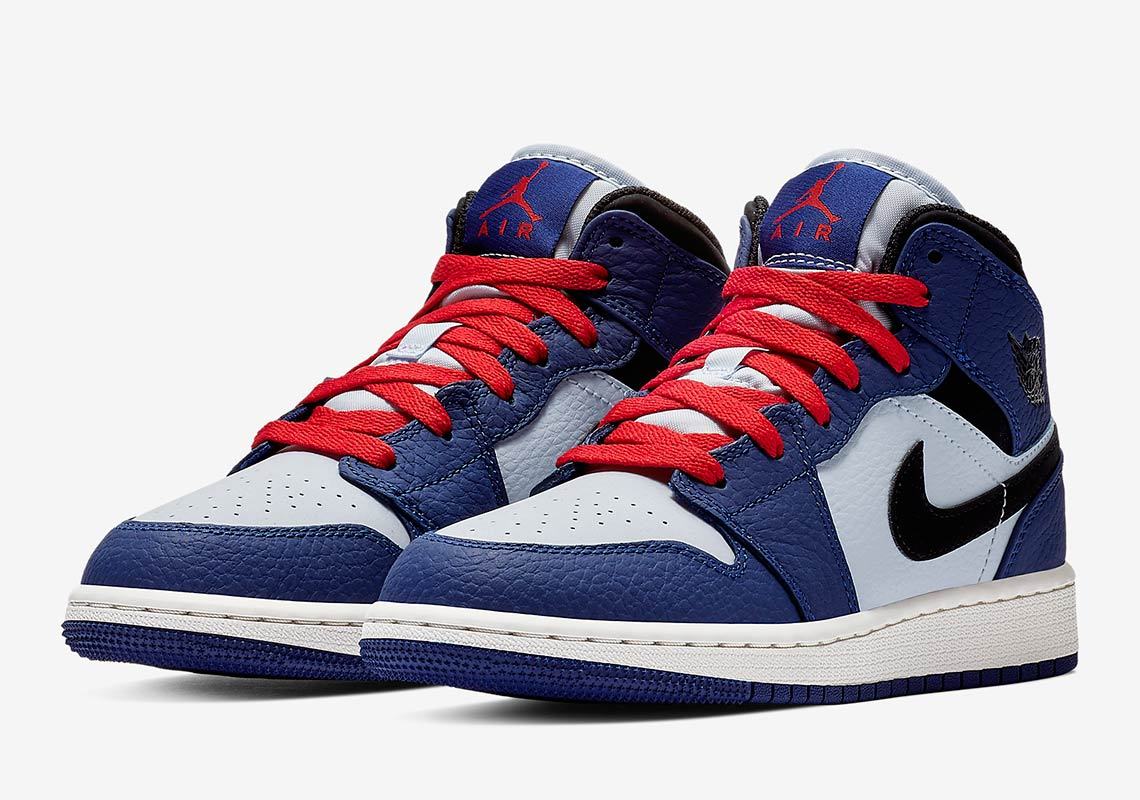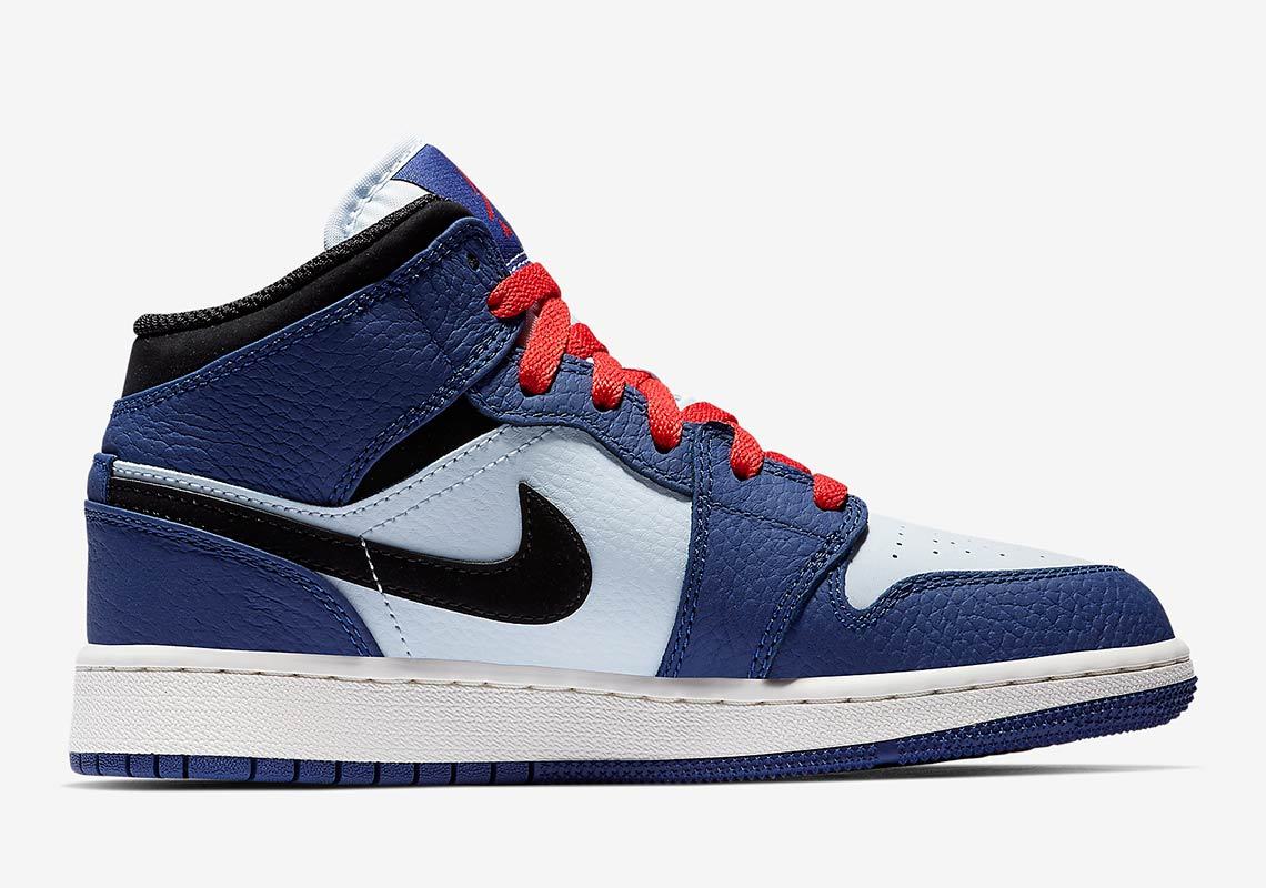 With the new “Spider-Man: Into The Spider-Verse” animated movie in theaters and Spidey’s special Air Jordan 1 “Origin Story” garnering interest among sneakerheads and comic book fans alike, the popular wall-crawler is enjoying a bright moment in the spotlight. Jordan Brand isn’t stopping at just one pair of Spidey sneakers either: a grade school-sized Air Jordan 1 Mid that calls upon alternate Spider-Verse style colors is set to drop soon as well. Calling more upon blue hues than red tones, the new Mids present a look that’s halfway in between a “Origin Story” and a “Game Royal” AJ1, using blue leather on the overlays, white leather on the underlays, and pitch-black leather for the Swoosh and collar. Red isn’t entirely absent though, as the laces and tongue branding both feature pops of hot crimson.